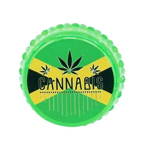 Minimalistická zelená plastová drtička v designu zátky s motivem Jamajské vlajky, ostré pyramidové hroty, magneticky uzavíratelná.