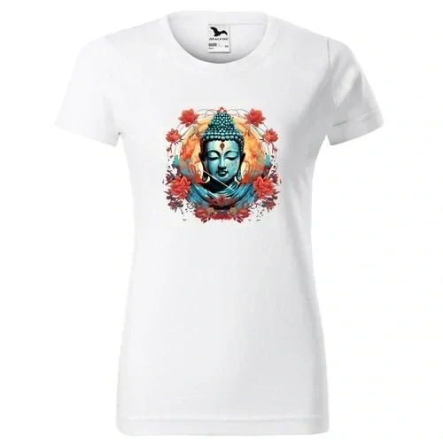 Bílé dámské hippie tričko s motivem Buddhy a lotosového květu. Střední gramáž trička 160 g/m² zajišťuje pohodlné celoroční nošení.