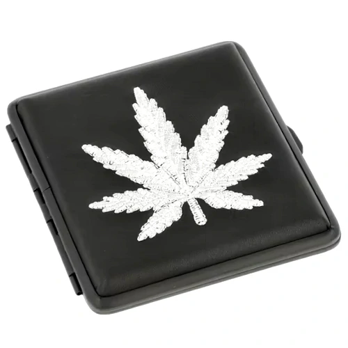 Koženková tabatěrka na 20 ks cigaret klasické velikosti (King Size). Kovové cigaretové pouzdro Cannabis v černé barvě s koženkovým matným povrchem. Na čelní straně najdeme bílý vyšívaný motiv s konopím. Zadní strana pouzdra je hladká. Cigarety jsou uvnitř tabatěrky zajištěny gumičkou.