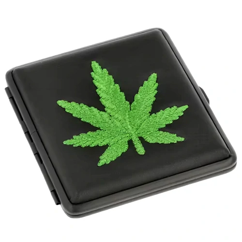 Koženková tabatěrka na 20 ks cigaret klasické velikosti (King Size). Kovové cigaretové pouzdro Cannabis v černé barvě s koženkovým matným povrchem. Na čelní straně najdeme zelený vyšívaný motiv s konopím. Zadní strana pouzdra je hladká. Cigarety jsou uvnitř tabatěrky zajištěny gumičkou.