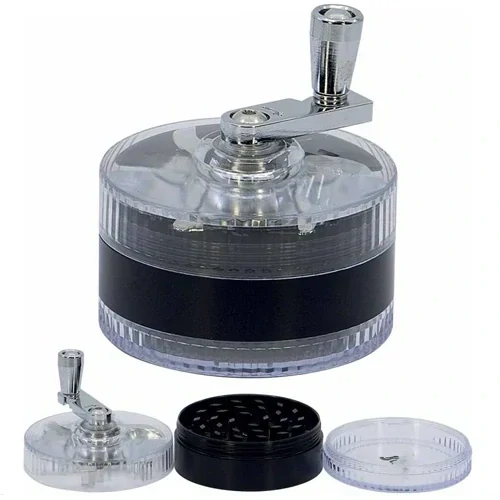 Drtič tabáku s klikou fungující na principu mlýnku. Třídílná konstrukce z kovu s průměrem přibližně 6 cm včetně záchytného sítka.