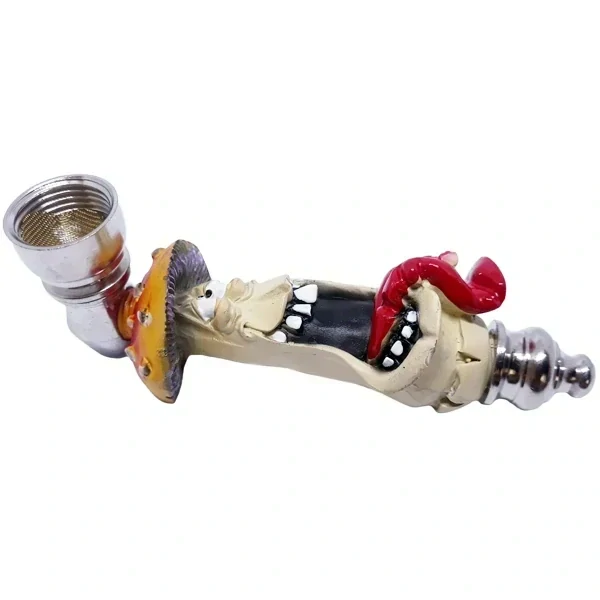 Kovová fajfka ve tvaru houbičky s vypláznutým jazykem. Materiál těla fajfky kov, houba z pryskyřice.