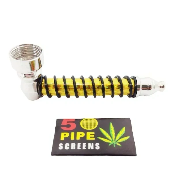 Menší kovová fajfka ve zlatavém odstínu ozdobená spirálou. Součástí fajfky je sada náhradních ocelových sítek.