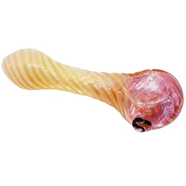 Skleněná fajfka ze skla Pyrex zdobená spirálovitými pruhy po celé délce s bočním turbem. Ploché dno kotlíku a boční kulička zabrání skutálení.