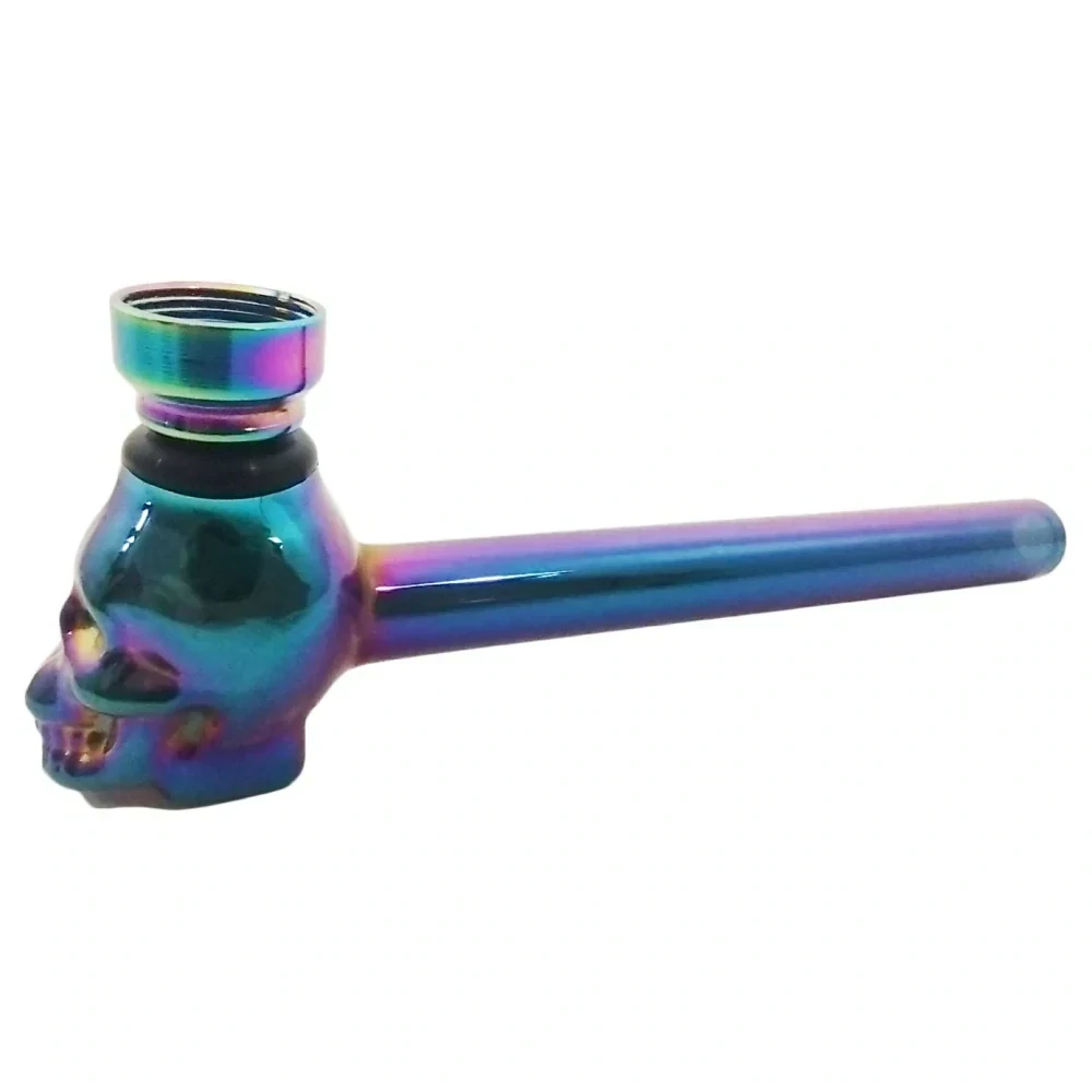 Skleněná fajfka v designu lebky s kovovým kotlíkem v délce 12 cm. Součástí fajfky je sada ocelových sítek, které tvoří dárkový set.