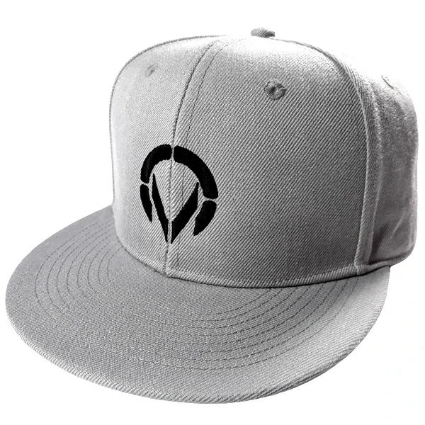 Šedá šestipanelová kšiltovka s rovným kšiltem a černou vexl výšivkou. Velikost nastavitelná plastovým zacvakávacím páskem.