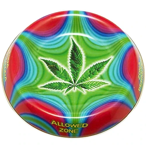 Kovový popelník na stůl s konopným listem na fraktálovém pozadí. Průměr popelníku: 15 cm.