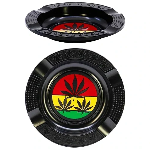 Praktický kovový popelník na stůl v rasta designu s ganja listy. Průměr popelníku: 10 cm. Vhodný jako dárek pro huliče.