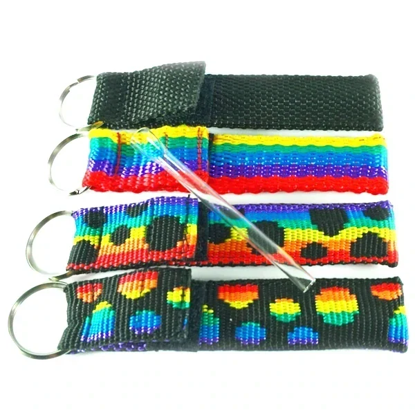 Čirá skleněnka s barevným pouzdrem, lze ji připevnit na klíčenku, uzavíratelná na suchý zip, délka skleněnky 8 cm.