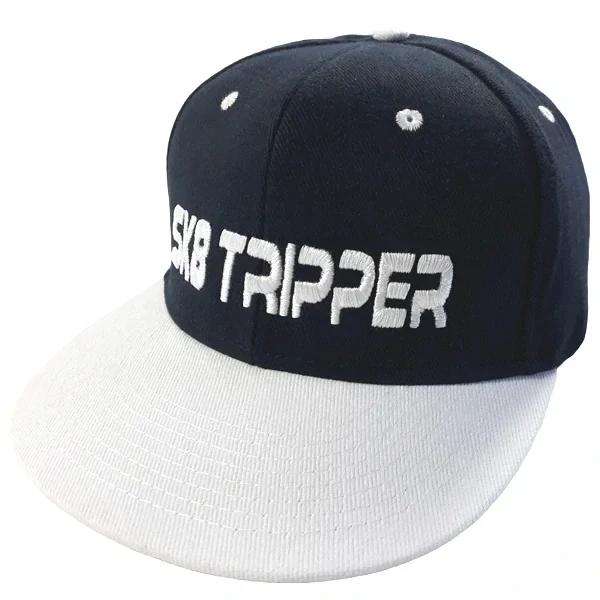 Tmavě modrá kšiltovka s rovným šedým kšiltem a šedou výšivkou SK8 Tripper.