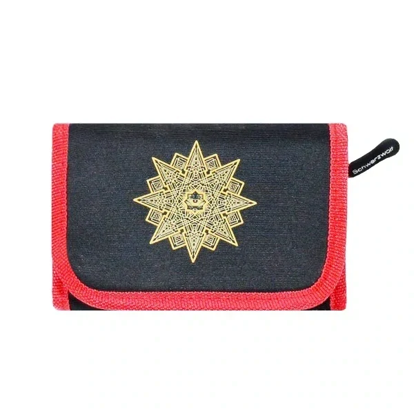 Černá textilní šrajtofle s mandalou – stylový a praktický doplněk pro každodenní použití i volnočasové aktivity. Bezpečné zapínání na suchý zip a červený lem dodávají moderní vzhled. Kvalitní potisk mandaly symbolizuje harmonii a energii. Zadní kapsa na mince se zapínáním na klasický zip zajistí bezpečné uložení drobných.