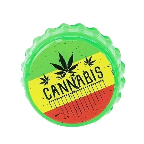 Minimalistická zelená plastová drtička v designu zátky s motivem Cannabis, ostré pyramidové hroty, magneticky uzavíratelná.